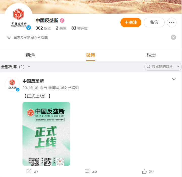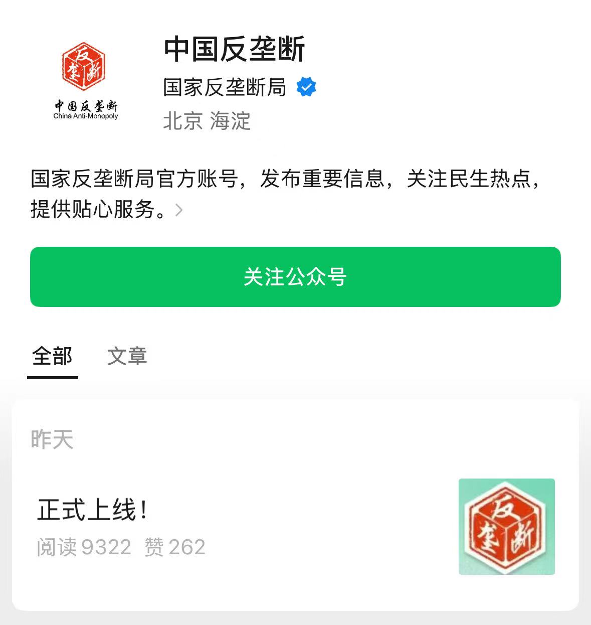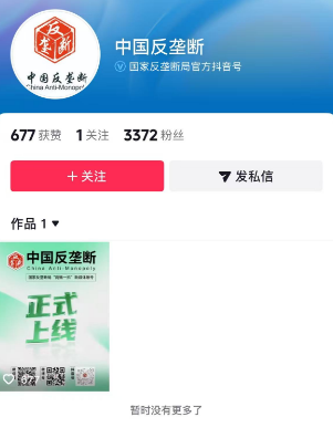国家反垄断局政务微信公众号、微博和抖音号上线开通