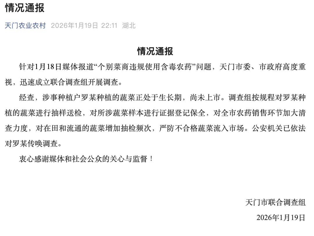 1月19日,湖北省天门市联合调查组发布情况通报:针对1月18日媒体报道“个别菜商违规使用含毒农药”问题,天门市委、市政府高度重视,迅速成立联合调查组开展调查。