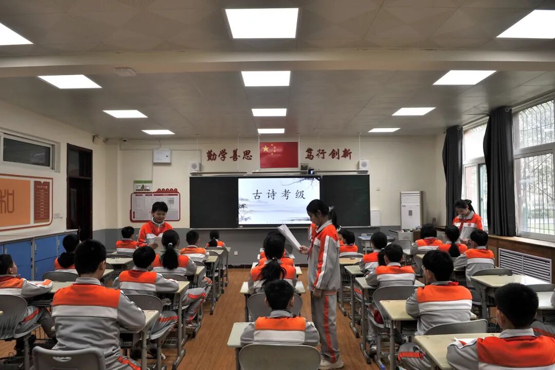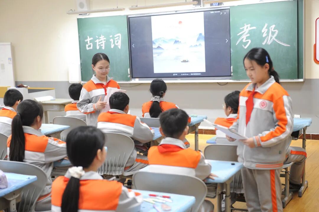 学校独创古诗词考级体系,将小学阶段需掌握的数百首诗词分为10级,每级设基础篇目与拓展篇目。一级童趣盎然,选取《咏鹅》《静夜思》等浅近之作;至五六级,则渐涉《将进酒》《春江花月夜》等长篇经典;达九十级,品析《满江红》《观沧海》等已成为学生的基本体验。