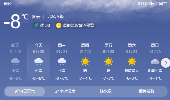 烟台北部和威海天气多云间阴有小雪局部中雪,其他地区天气晴间多云。半岛地区北风4级阵风5~6级,其他地区北风短时南风3~4级。最低气温:鲁西北和鲁中山区-12~-10℃,局部低于-14℃,沿海地区-6~-4℃,其他地区-9~-7℃。最高气温:鲁中山区和半岛内陆地区-5℃左右,其他地区-1℃左右。