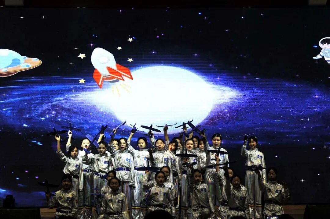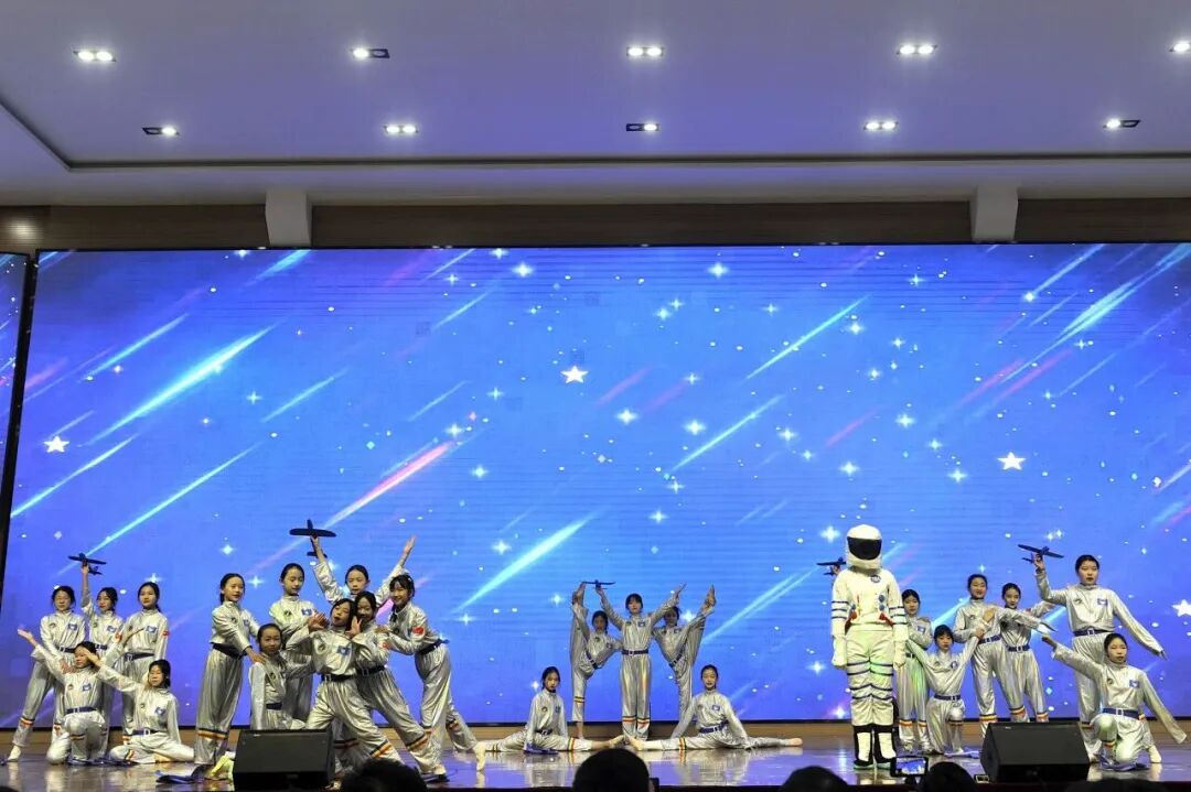 元旦晚会的舞台上,孩子们化身小小“航天追梦人”,身着银色演出服翩翩起舞。星空背景下,灵动的舞姿搭配充满科技感的造型,将航天梦想融入舞蹈,惊艳了全场,也让一学期的舞蹈积淀在舞台上完美绽放!