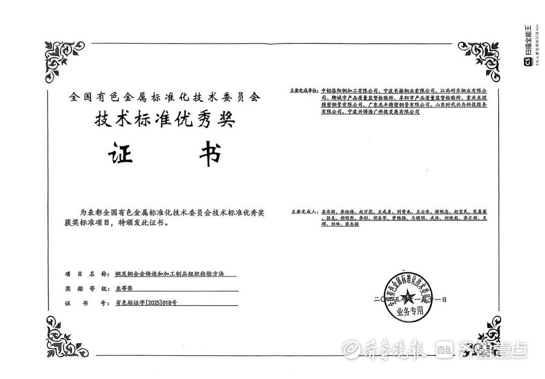 近日,由市质检所两名技术人员参与起草的YS/T 448-2025《铜及铜合金铸造和加工制品组织检验方法》行业标准,获评全国有色金属标准化技术委员会“技术标准优秀奖”,彰显了市质检所在有色金属检验检测领域的专业实力。