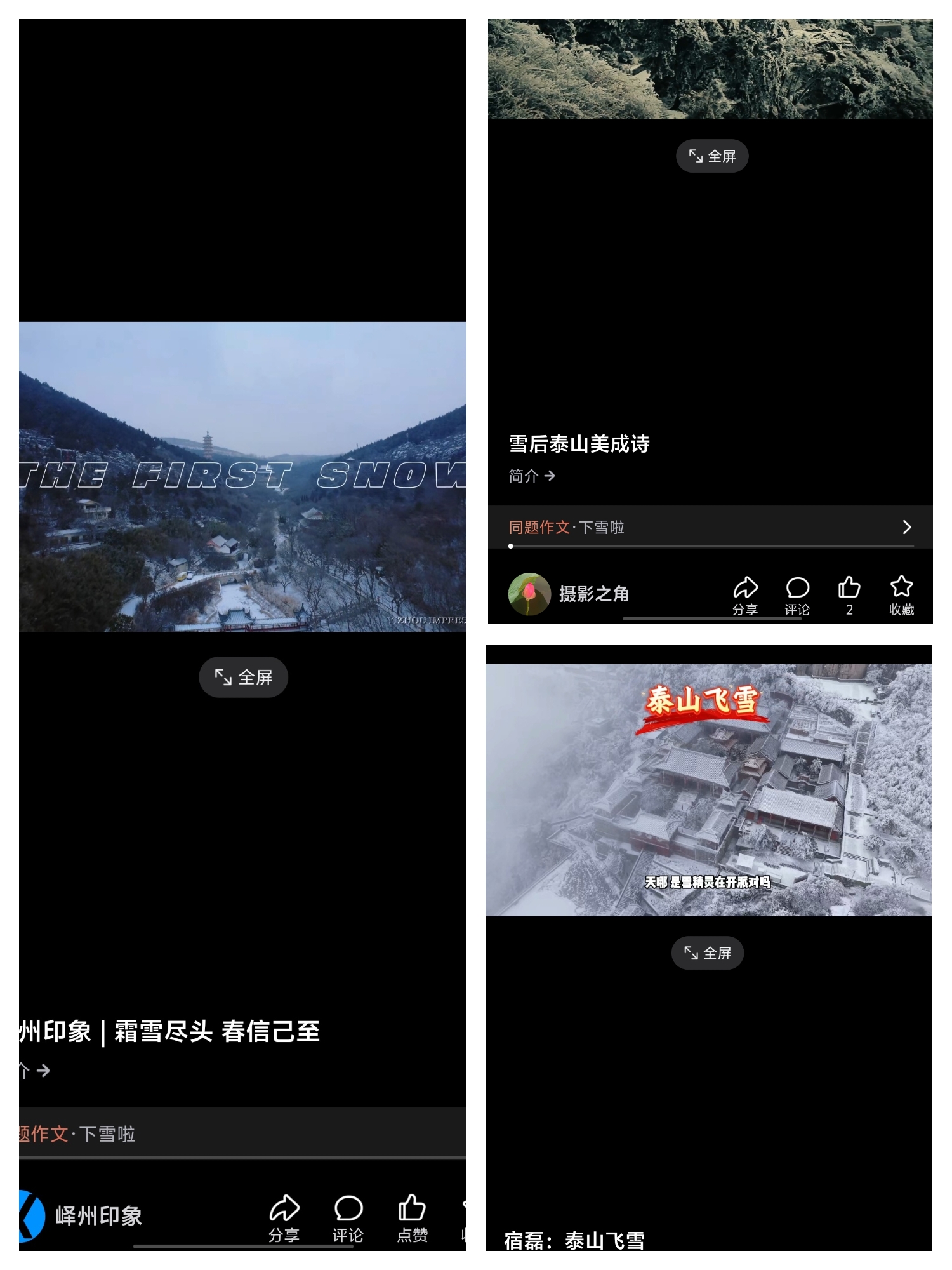 当然,在这场大规模雨雪天气中,雪景是当之无愧的主角。“峄州印象”“摄影之角”等号主们的镜头里,有泰山之巅的磅礴,有济南老城区青砖黛瓦上那抹温柔的素白,也有乡村田野一望无际的静谧。更妙的是,“李沧融媒”还搬来了“外援”——AI生成的奇幻雪景:李沧的地标性建筑在风雪中解锁了新皮肤……人类的镜头与AI的算法同台竞技,共同举办了一场跨越虚实边界的“雪景博览会”,让人不禁莞尔:这场雪,下得可真够“出圈”的。