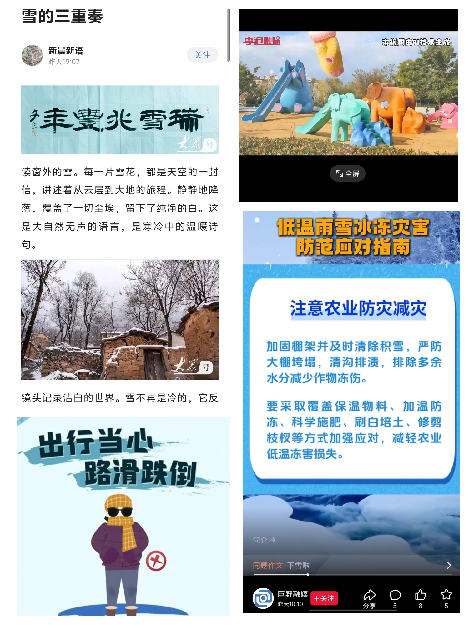 而在一片风花雪月中,也不乏格外“接地气”的创作——实用的《雪天出行安全指南》。“巨野融媒”从农业减灾到车辆出行,介绍了10余种低温雨雪冰冻灾害的防范应对指南;“巨野融媒”从老人防跌倒到孩子打雪仗的“安全守则”,这些充满生活智慧的提醒,犹如寒冷冬日里一杯暖手的热茶,贴心至极。文学与生活在此刻达成了完美和解:既仰望雪的诗意,也走好脚下的湿滑之路。
