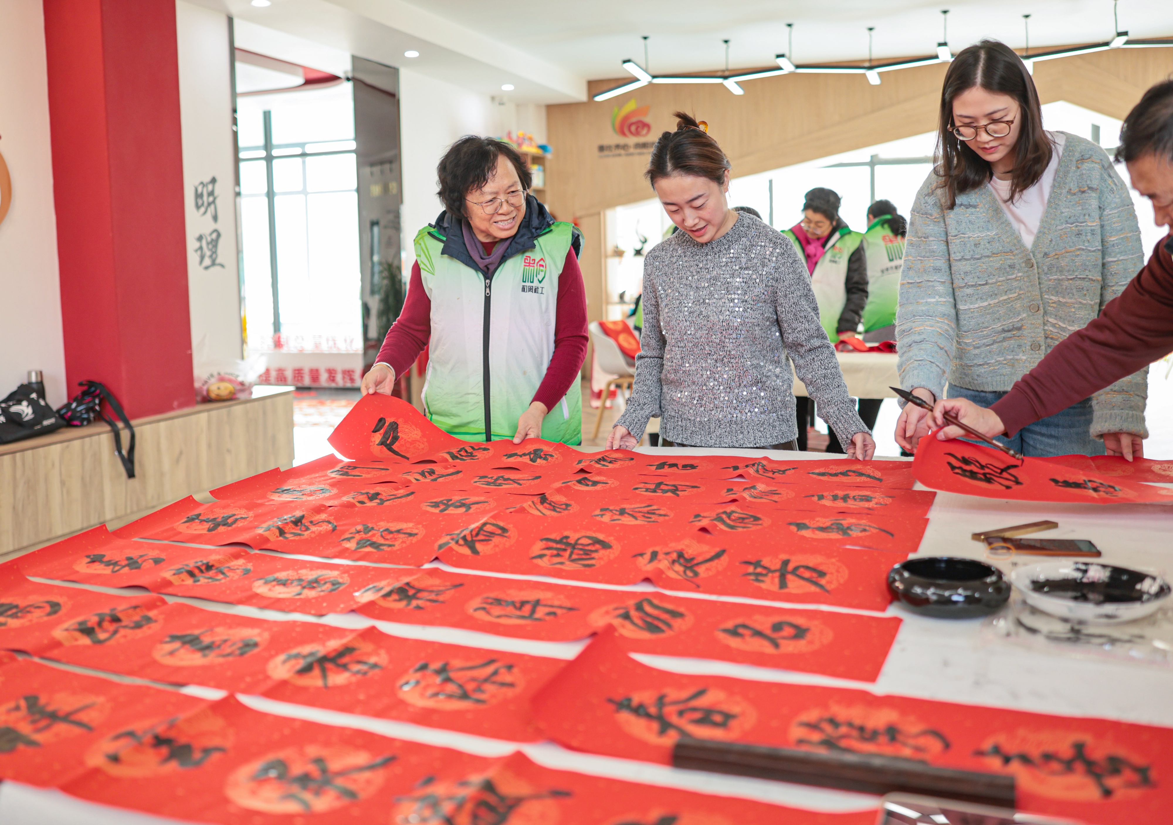 活动现场,10余名退休老干部书法爱好者铺纸研磨、挥毫泼墨,书写的春联既含辞旧迎新的吉祥寓意,又融入民政“以人民为中心”的服务理念与社区共建初心,笔力遒劲的作品赢得居民阵阵赞叹。此次活动共为社区居民赠送春联、福字近千副。