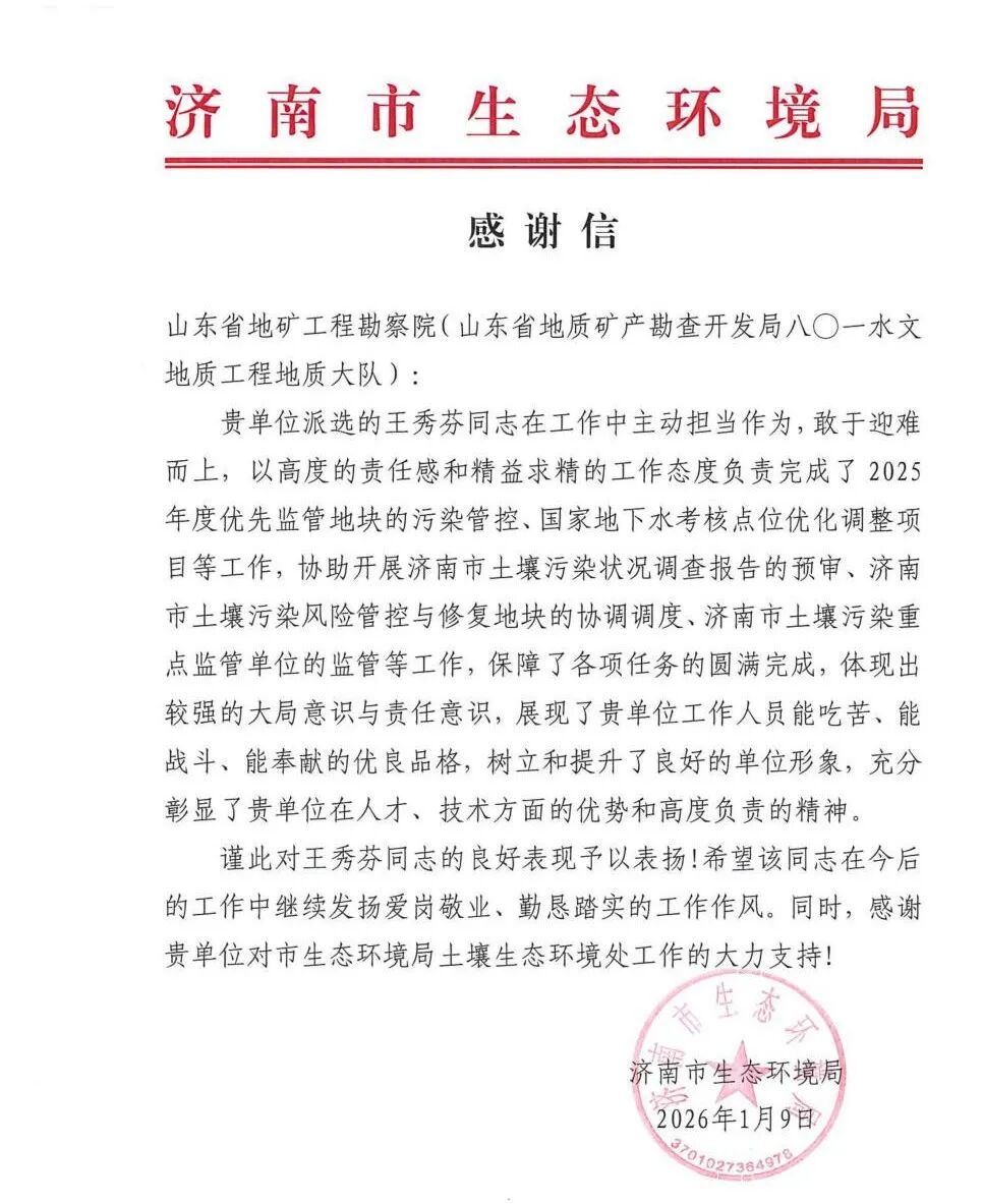 近日,济南市生态环境局给山东省地矿工程勘察院发来感谢信,对该院派选的王秀芬同志在2025年度土壤污染防治工作中的表现给予充分肯定和高度评价,对该院大力支持市生态环境局土壤生态环境处的工作表示感谢。信中指出,王秀芬同志在工作中主动担当作为,敢于迎难而上,以高度的责任感和精益求精的工作态度负责完成了2025年度优先监管地块的污染管控、国家地下水考核点位优化调整项目等工作,协助开展济南市土壤污染状况调查报告的预审、济南市土壤污染风险管控与修复地块的协调调度、济南市土壤污染重点监管单位的监管等工作,保障了各项任务的圆满完成,展现了地质工作者过硬的专业素养和责任担当。
