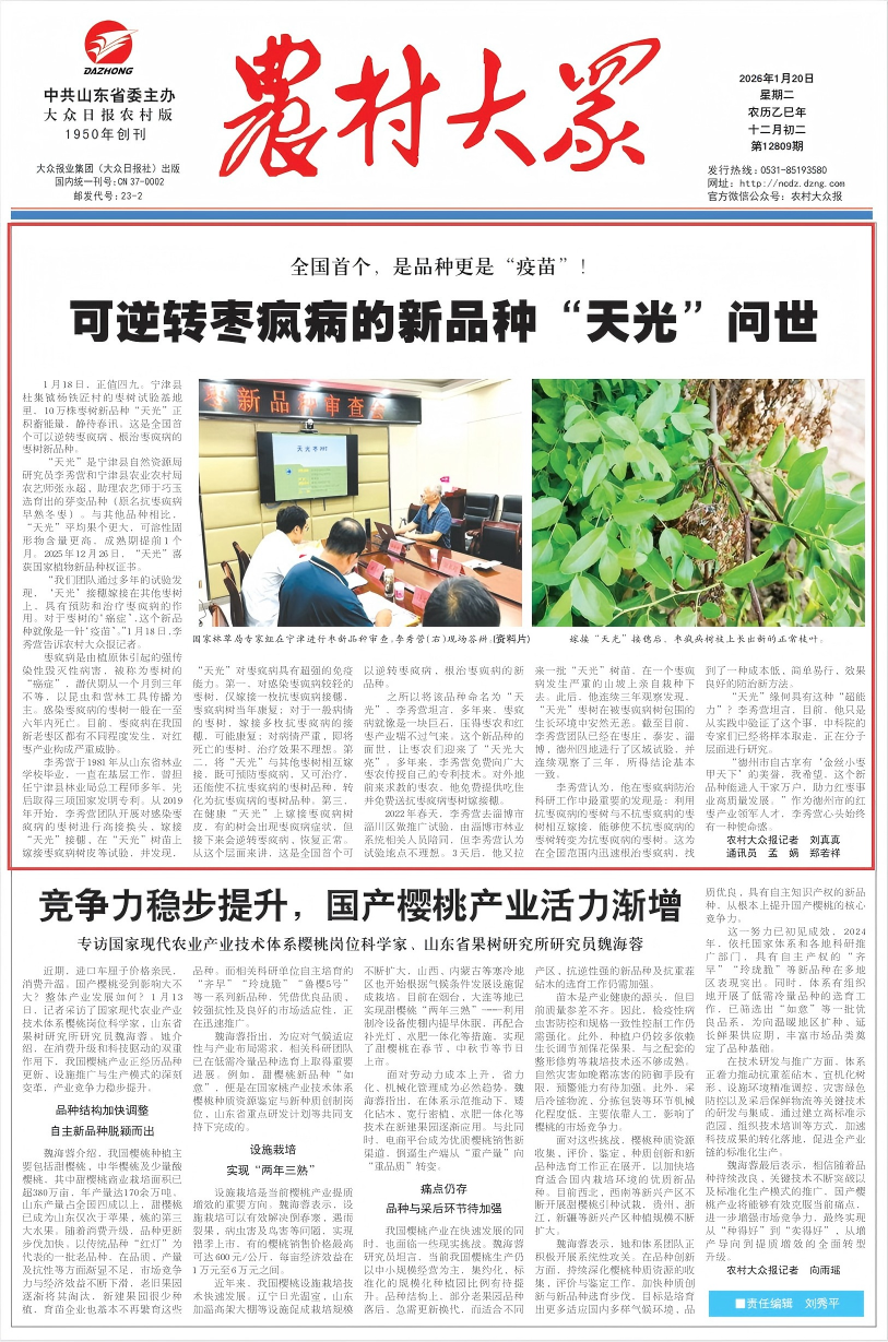 今日报纸头条 | 全国首个!可逆转枣疯病的新品种“天光”问世