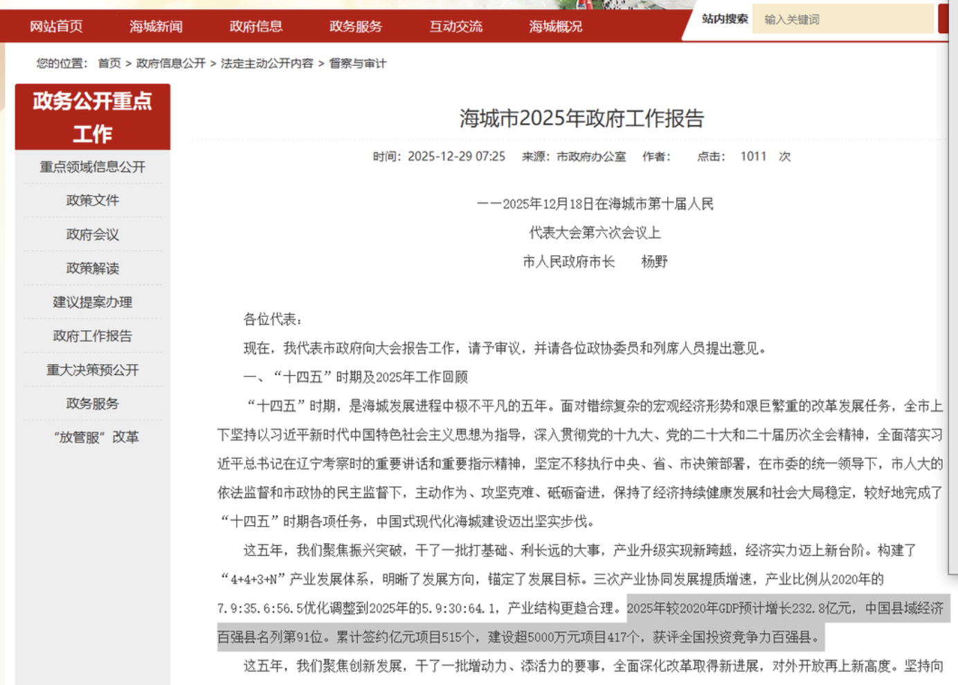 记者查询发现,海城市人民政府网发布的《海城市2025年政府工作报告》也提到了该“荣誉”,报告中指出海城市2025年较2020年GDP预计增长232.8亿元,中国县域经济百强县名列第91位。累计签约亿元项目515个,建设超5000万元项目417个,获评全国投资竞争力百强县。