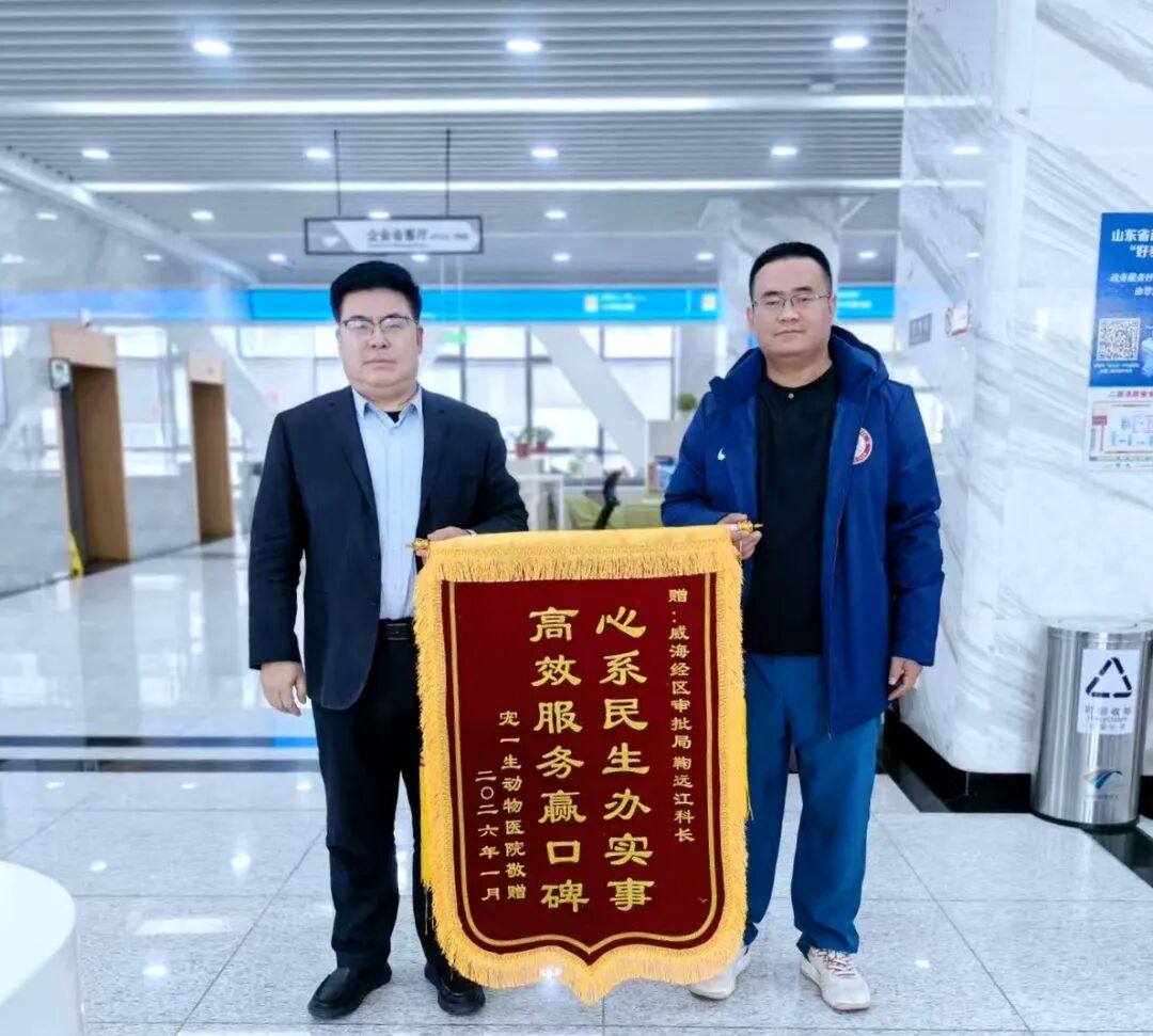“当天提交材料,当天就拿到动物诊疗许可证,执业兽医师备案也同步完成,真是太高效了!”1月14日,威海宠一生动物医院经办人焦先生,将一面印着“心系民生办实事,高效服务赢口碑”的锦旗送到威海市经开区行政审批局社会事务综合受理窗口,为窗口的高效便捷的服务点赞。