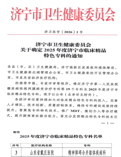 2026年1月16日,济宁市卫生健康委下发了《关于确定2025年度济宁市临床精品特色专科的通知》,戴庄医院精神障碍合并躯体疾病科成功获评济宁市临床精品特色专科。