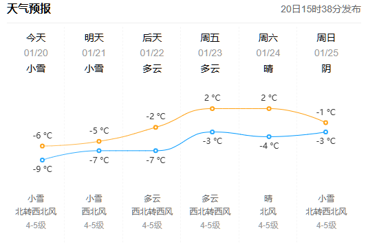 今夜到明天,阴有小雪局部中雪,西北风5~6级阵风7级,-9℃~-5℃;明天晚上到后天,阴有小雪转多云,西北风5~6级阵风7级逐渐减弱到4~5级,-7℃~-2℃;23日,多云间晴,偏西风转西北风4~5级阵风6级,-7℃~2℃。