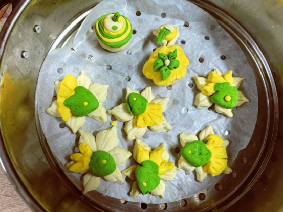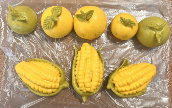 课堂上,在面点老师的指导下,同学们从揉面、调色学起,先掌握面团的软硬度与天然色素(南瓜泥、菠菜汁)的调配,随着学习的深入,逐渐解锁了切、捏、卷、压等传统技法;从简单的花朵造型练起,逐渐挑战带纹路的玉米馍、水果馍。期末结课时,同学们以小组为单位开启创意主题创作,以“四季”“吉祥”为主题,完成了“花开富贵”“萌兔抱春”“秋实玉米篮”等组合花馍。