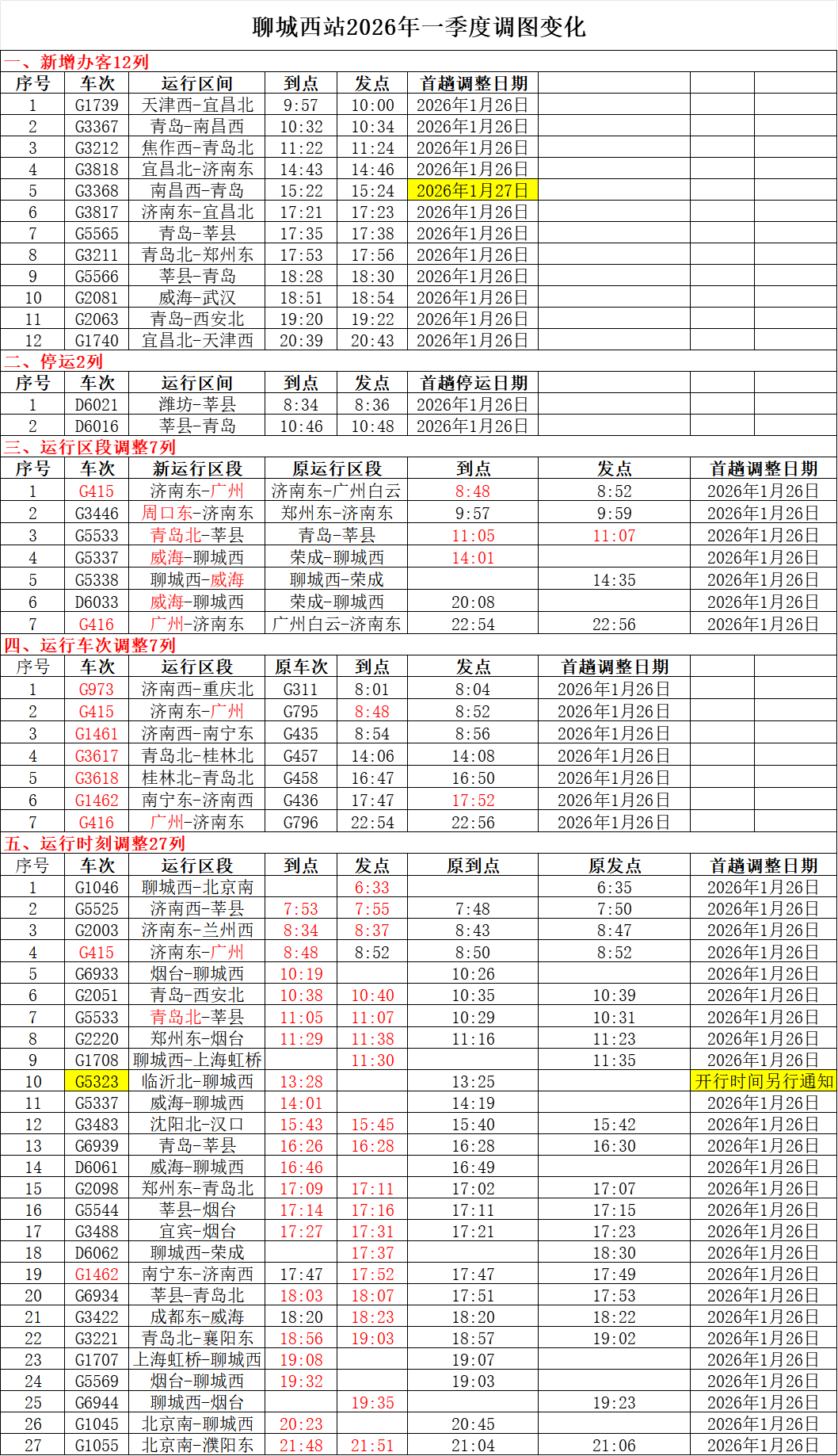 1月26日铁路调图!聊城西站将增开12列旅客列车,多趟列车有变
