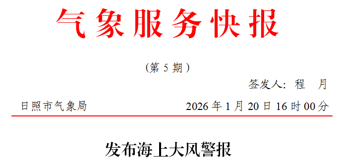 日照市气象台1月20日16时00分发布海上大风警报。