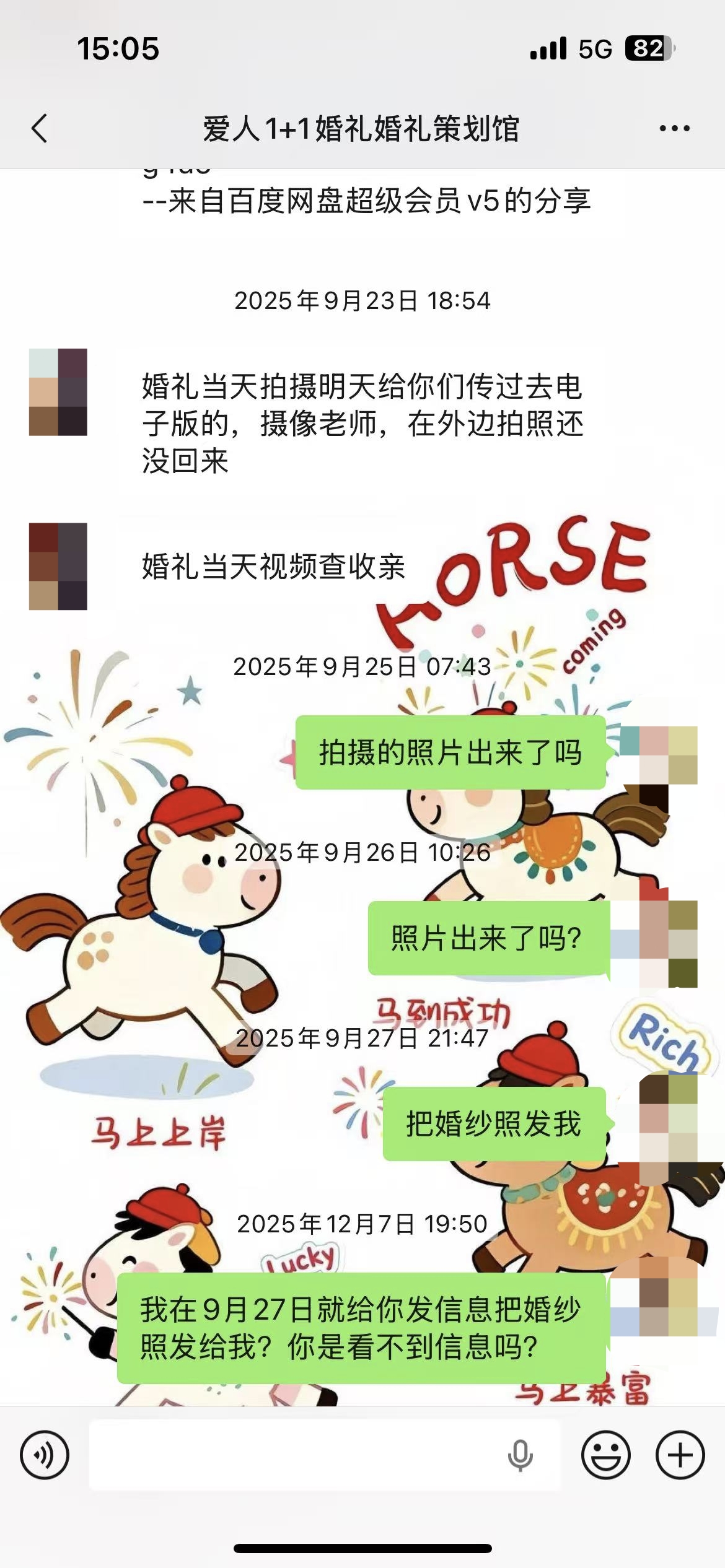 “拍完之后给过我们几张成片,但修得人都变形了,我们非常不满意。”李龙说,此后,再也没收到其他的照片,其妻子通过微信与婚庆沟通,也一直未收到答复。