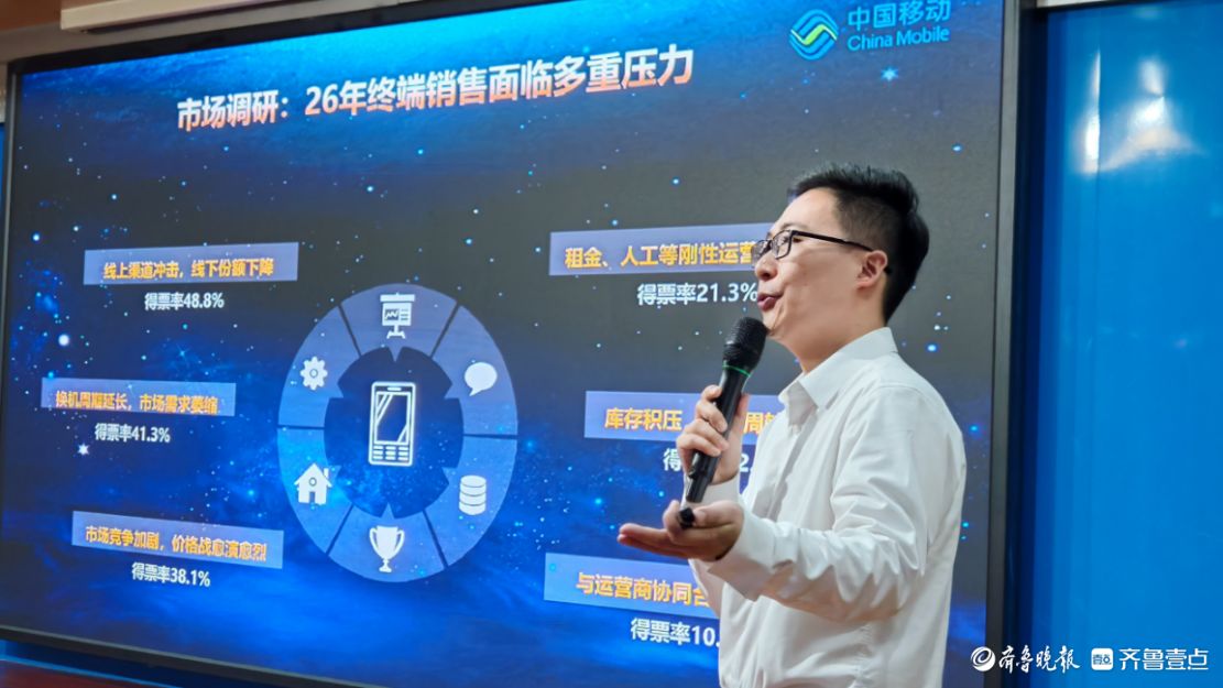 在“数智升级”篇章,菏泽移动渠道运营中心主任周通带来题为《骏马奔腾新征程 同心筑梦赢未来——移动市场发展新蓝海》的主旨演讲。周经理在演讲中首先回顾了2025年与合作伙伴共同取得的丰硕成果。随后,他深入分析了当前终端与通信市场的发展趋势与广阔前景。面向2026年,周经理重点阐述了公司在渠道投入、政策支持等方面的全面升级计划,并探讨了代理商如何把握融合业务、终端销售等新机遇,实现加速发展。最后,他通过分享部分优秀代理商的具体实践案例,为共赢未来提供了清晰的路径与信心。