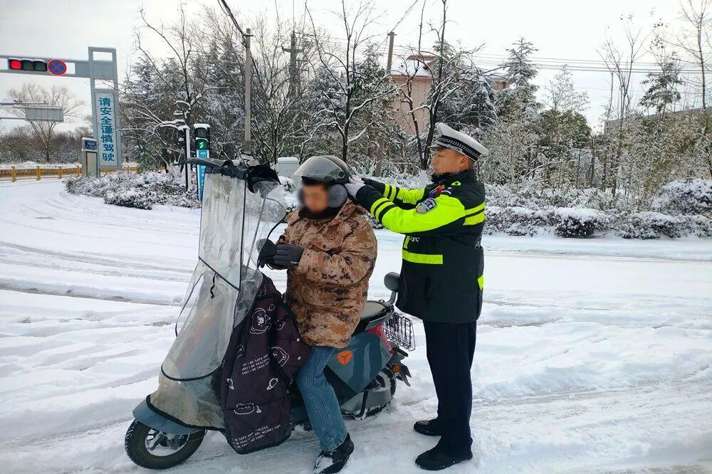 交管大队路面执勤人员提醒群众戴好头盔,减速慢行,注意安全。
