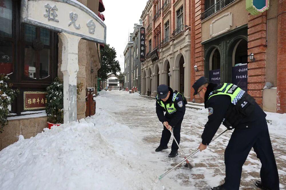运河古城派出所民辅警协助台儿庄古城工作人员对路面积雪进行清扫,为游客提供一个安全通畅的旅游环境。