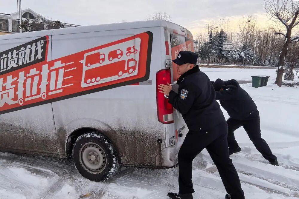 群众车辆深陷雪坑无法行驶,泥沟派出所民辅警合力推车,成功帮助车主脱困。