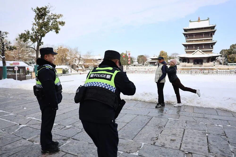 运河古城派出所民辅警为游客拍摄台儿庄古城美丽雪景照片。