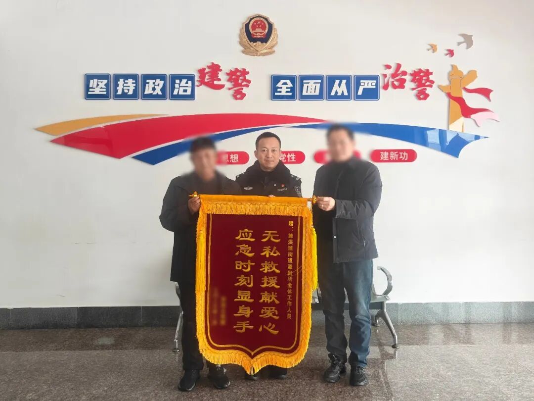 另一边,青岛市公安局城阳分局城阳派出所火车站综合治理办公室也迎来了暖心一幕,1月17日上午,居民肖先生与孙女士夫妇手持一面鲜红锦旗专程送到辅警袁宪斌和郑晓手中。