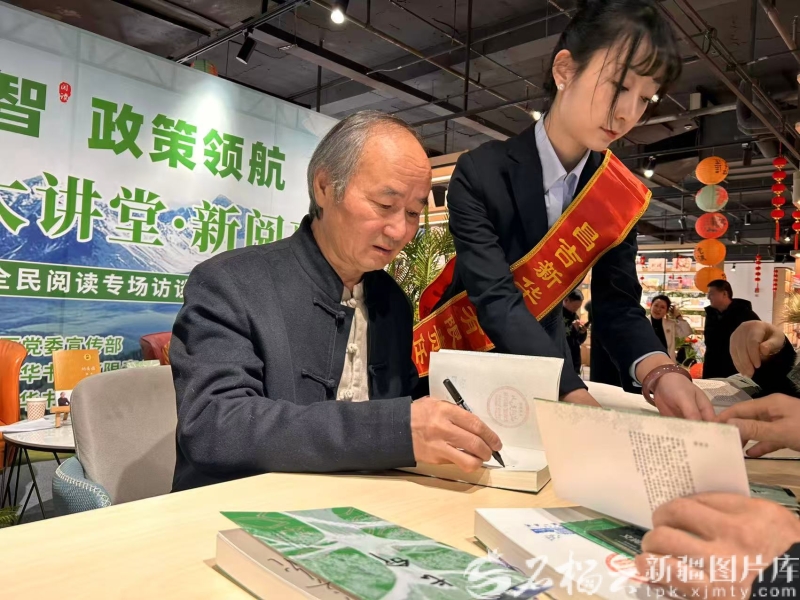 1月20日,“文润天山大讲堂·新阅惠”刘亮程全民阅读专场访谈现场,刘亮程为读者签名。石榴云/新疆日报记者阿比拜摄