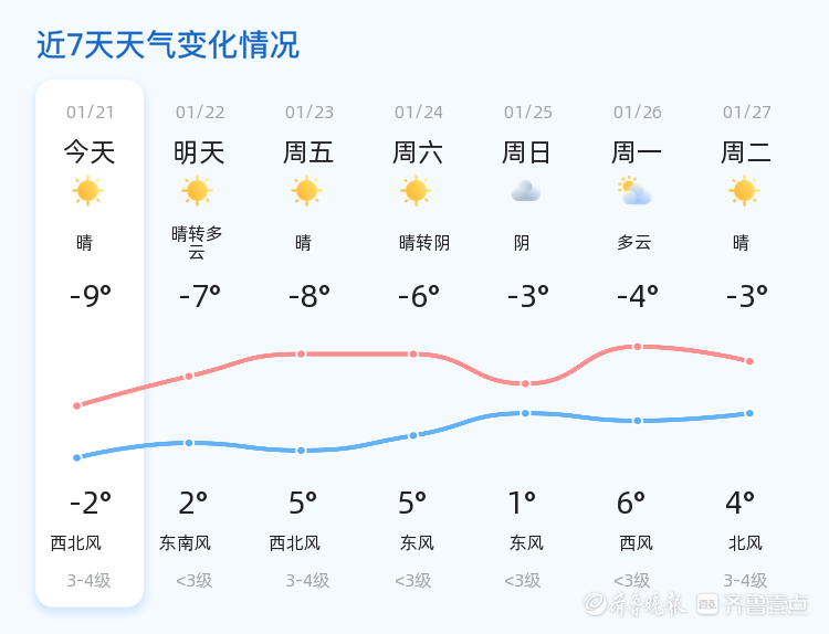 今天是1月21日,星期三,农历十二月初三。潍坊市今日天气晴朗,气温较低,最高气温为-2℃,最低气温为-9℃,目前气温为-8.4℃,伴有西风2级,空气湿度为44%,PM2.5指数为53。各区天气情况基本一致,均为晴朗天气,气温略有差异,但整体相差不大。nn明天潍坊市天气将转为晴转多云,气温有所回升,最高气温将达到2℃,最低气温为-7℃,风向转为东南风,风力较小。与今日相比,明天天气较为温暖,但风力较小,市民需注意防寒保暖。nn未来三天,潍坊市天气以晴为主,气温将呈现波动趋势,最高气温可达5℃,最低气温为-9℃。周五和周六将有西北风和东风交替出现,风力较大,市民需注意防范大风天气带来的影响。nn温馨提示