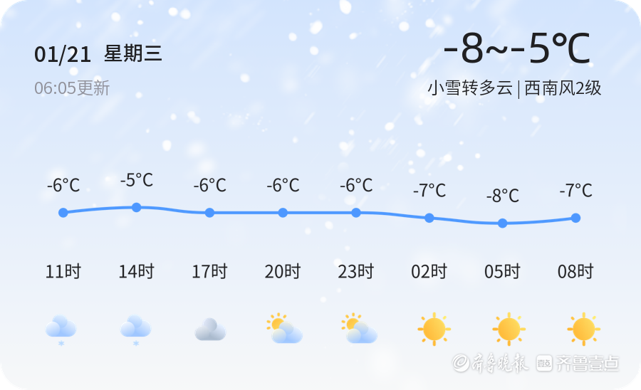 今天是2026年1月21日,星期三,农历十二月初三。烟台市今日天气为小雪转多云,气温在-8℃到-5℃之间,西南风2级,空气湿度76%。空气质量指数为优(PM2.526),适合户外活动。由于今日有降雪,路面可能湿滑,建议市民出行时注意防滑,驾车时减速慢行,保持安全距离,确保行车安全。
