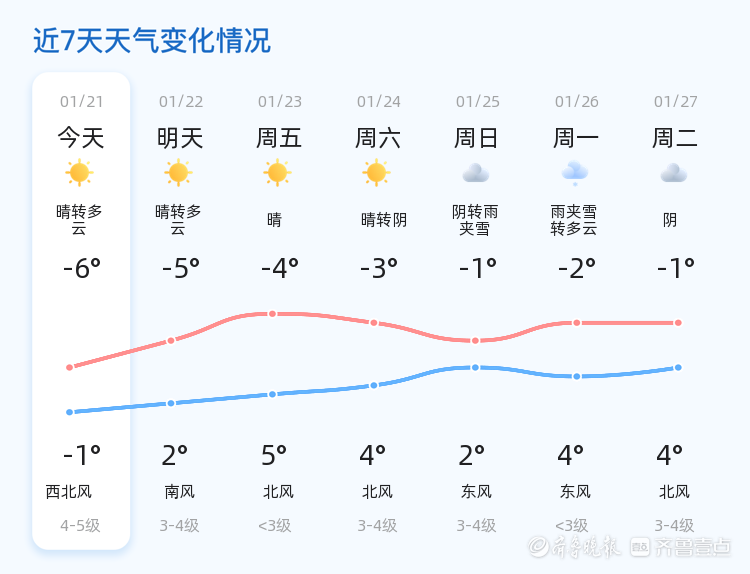 未来三天,日照市天气趋势呈现回暖迹象。周五最高气温将达到5°C,最低气温-4°C;周六天气晴转阴,最高气温4°C,最低气温-3°C;周日则可能出现阴转雨夹雪的天气,最高气温2°C,最低气温-1°C。市民需关注天气变化,尤其是雨夹雪天气可能导致道路湿滑,出行时请注意安全,减速慢行。