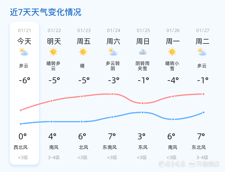 今天是2026年1月21日,星期三,农历十二月初三。济宁市今天天气多云,气温范围在-6℃至0℃之间。全市各区天气状况基本一致,风力较小,北风1级,空气湿度为79%,PM2.5指数为31,空气质量良好。市民朋友们在出行时可以适当增添衣物,注意保暖。