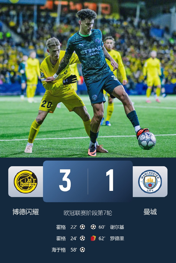 北京时间1月21日1:45,欧冠联赛小组阶段第7轮开打,英超豪门曼城客场对阵博德闪耀。此役哈兰德延续低迷表现,罗德里吃到红牌,博德闪耀球员卡斯帕-霍两分钟两球,海于格打进世界波,曼城1-3客场爆冷,遭遇各项赛事两连败。