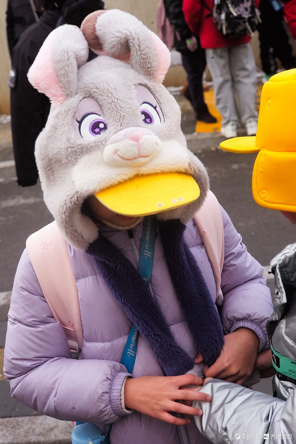 1月19日,在济南宁康街,头戴兔子头套的小学生放学后走出校门,软乎乎的卡通头套在清冷的空气里格外亮眼,为严寒的午后添上了一抹鲜活的童趣。王剑摄