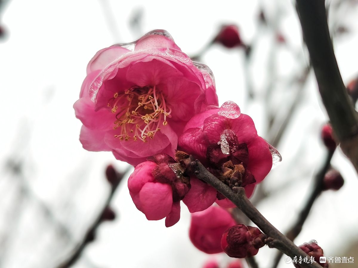 1月19日,大寒节气至,临沂沂河新区迎来一场冻雨雪,红梅枝头刚刚绽放的红梅花儿,被一层层冰雨和雪花紧紧裹住,晶莹剔透的景致格外迷人。高军摄