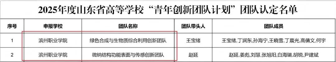近日,山东省教育厅公布了2025年度“青年创新团队计划”立项名单。滨州职业学院化工与能源学院王宝绪博士负责的“绿色合成与生物质综合利用创新团队”及机电工程学院赵延博士负责的“微纳结构功能表面与传感创新团队”成功入选,实现了学校在该项目上零的突破,标志着学校在省级青年科研团队建设中取得实质性进展。