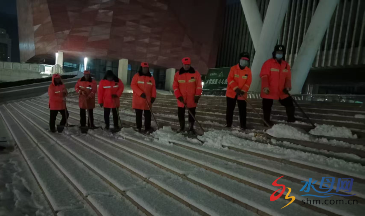 截至21日清晨7时,文化中心和虞美人广场共累计出动清雪防滑人员60余人次,累计清运积雪100余方,广场地面大面积雪已基本清理完毕。