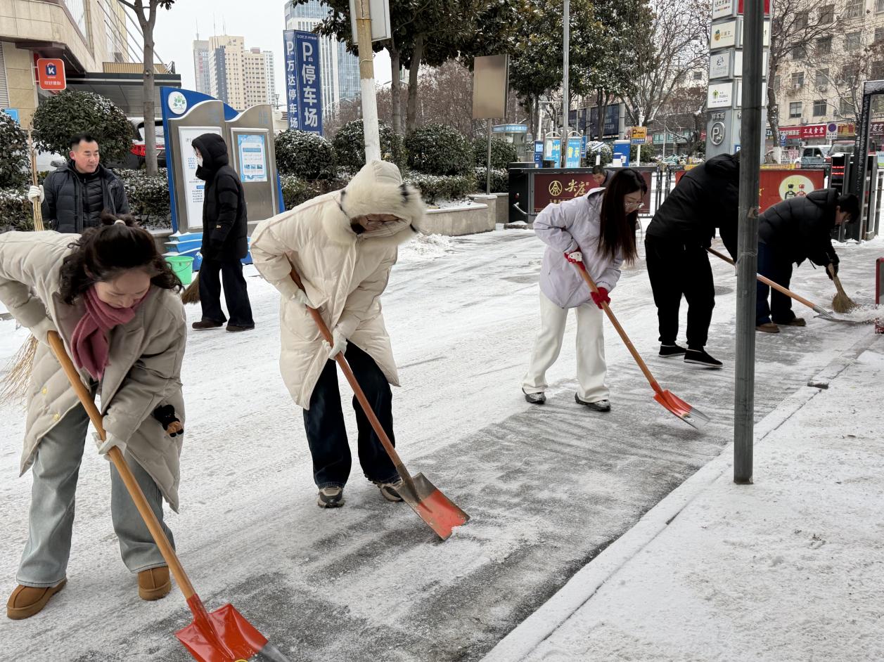 “大家注意脚下,别滑倒!先把主干道的雪清理出来,方便居民出行。”随着一声号召,大家带着铁锹、扫帚、除雪铲等工具奔赴各主干道、小区进出口、单元楼门口等重点区域。现场分工协作,配合默契,挥锹铲冰、推雪成堆,动作干脆利落,遇到被车辆压实的硬冰,便几人合力用铁锹撬起、击碎。最后将积雪归集到绿化带边缘,避免路面二次结冰和积雪堆积。