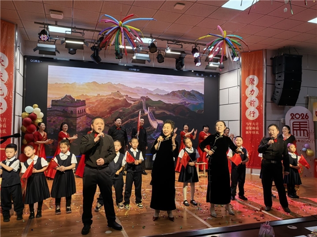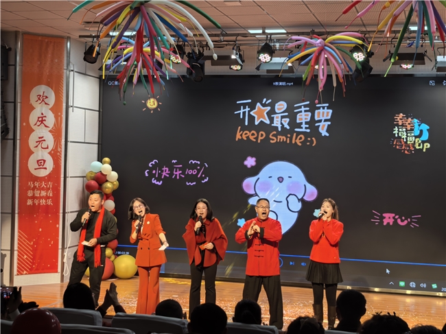 联欢活动在温馨热烈的氛围中渐入高潮,学校领导班子成员走上舞台,为全体师生带来合唱节目。熟悉的旋律响起,领导们用饱含深情的歌声,传递着对全校师生的新年祝福,也表达了与师生们携手共进、筑梦前行的坚定信念。歌声真挚动人,台下师生纷纷挥舞双手呼应,台上台下融为一体,温暖的情谊在歌声中传递,团结的力量在旋律中凝聚,将整场联欢活动的气氛推向顶点。