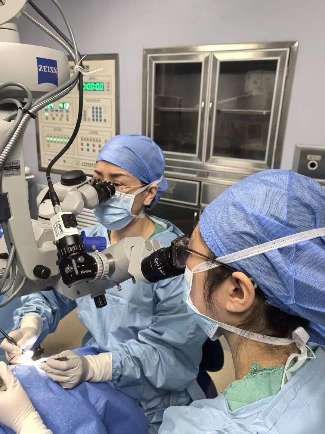 面对如此复杂危重的病情,青光眼科组织了术前讨论。患者眼部条件极差,多次手术导致结构紊乱,持续高眼压对视神经构成持续性损害,必须尽快进行有效干预。传统单一手术方式难以破解恶性青光眼的多重机制。经过缜密评估,以张苗苗主任医师、孙中华副主任医师为核心的手术团队为徐奶奶“量眼定制”了联合手术方案:右眼小梁切除术联合前部玻璃体切除术。