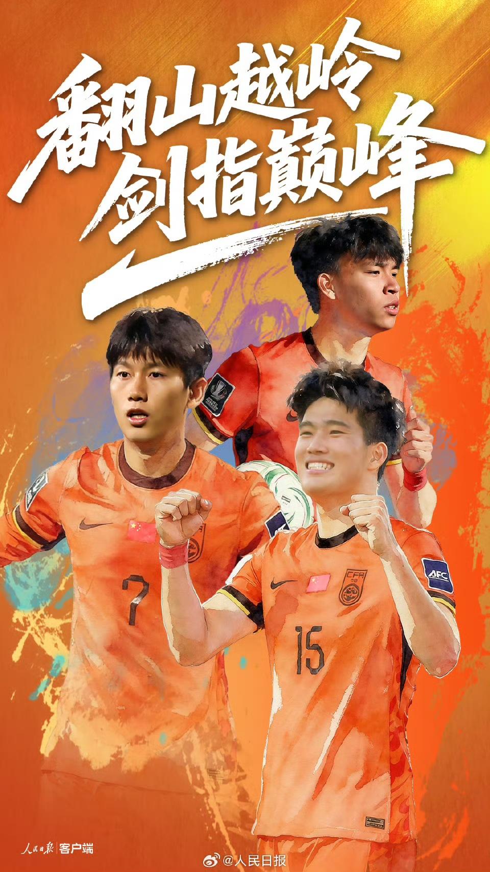 《人民日报》客户端发布了《翻山越岭,剑指巅峰》的海报,希望U23国家队能站在最高的领奖台上。