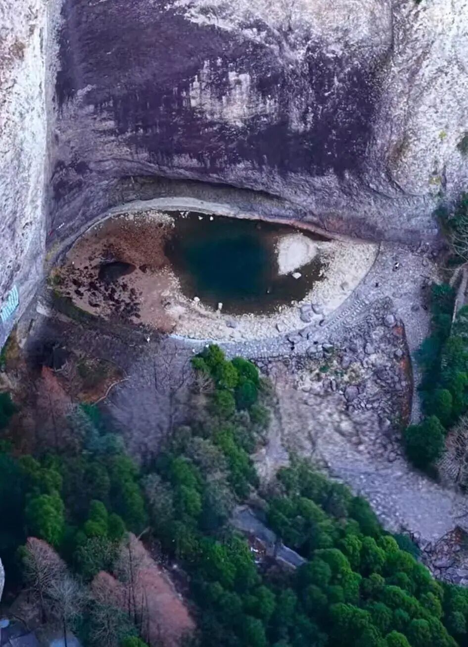 从视频画面可见,这只“龙眼”整体轮廓清晰:潭中央残留的深绿色水域宛如深邃的“瞳孔”,周围浅米色与灰褐色岩壁构成了“眼白”,上方深色岩石凹陷则形似“上眼睑”褶皱。整只“眼睛”镶嵌在灰白色崖壁底部,与下方深绿树林形成鲜明对比,更显生动立体。