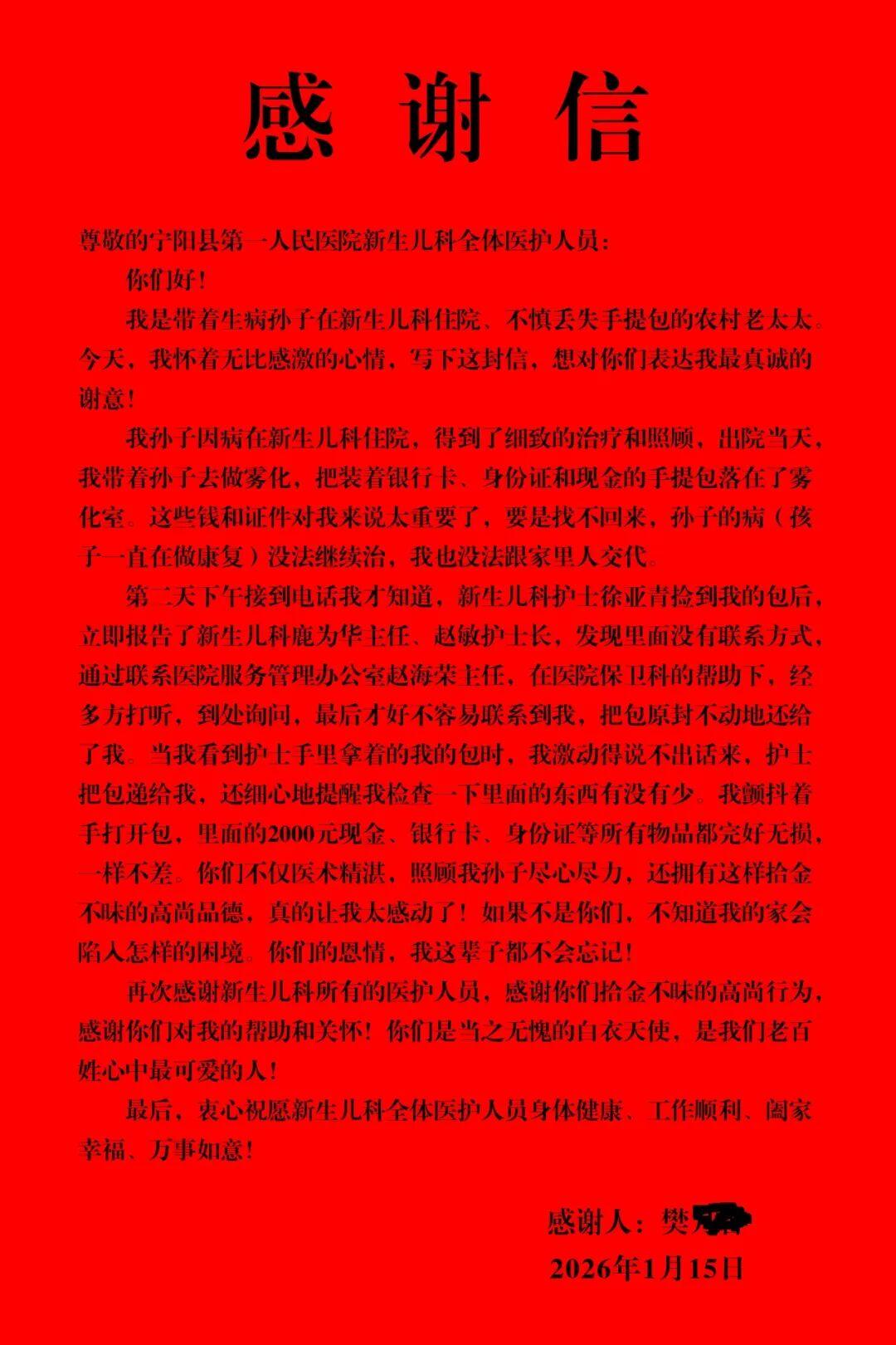 医者仁心,不止于精湛医术的救治,更藏于举手投足的善意。近日,宁阳县第一人民医院新生儿科医护团队收到一封感谢信,字里行间满是真挚的感激之情,讲述了一段医护人员拾金不昧、全力寻主的暖心故事,让这个寒冬充满了温情。
