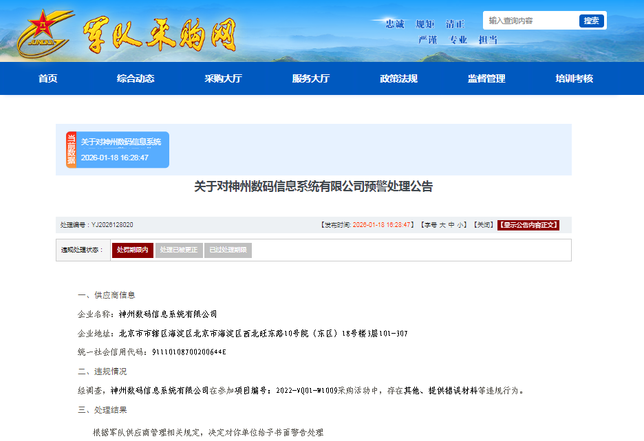 据悉,处理部门根据军队供应商管理相关规定,决定对该单位给予书面警告处理。处理编号:YJ2026128020。违规处理状态:处罚期限内。
