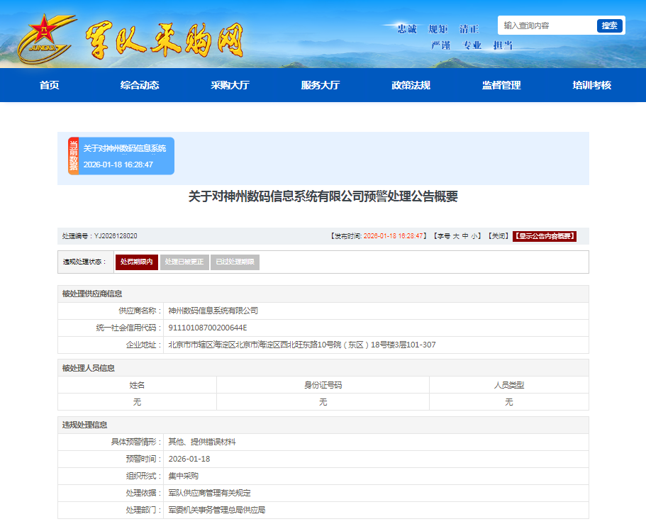 因提供错误材料等,神州信息旗下神州信息系统公司收军队采购预警