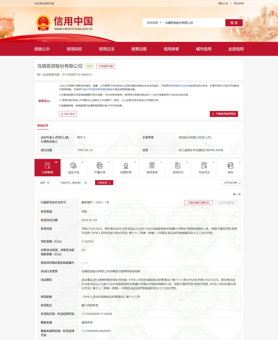 近日,国家税务总局嘉兴市税务局对乌镇旅游股份有限公司因涉嫌虚假纳税申报的行为作出行政处罚决定。根据处罚决定书(文号:嘉税稽罚﹝2026﹞1号),该公司被处以罚款21629.42元。