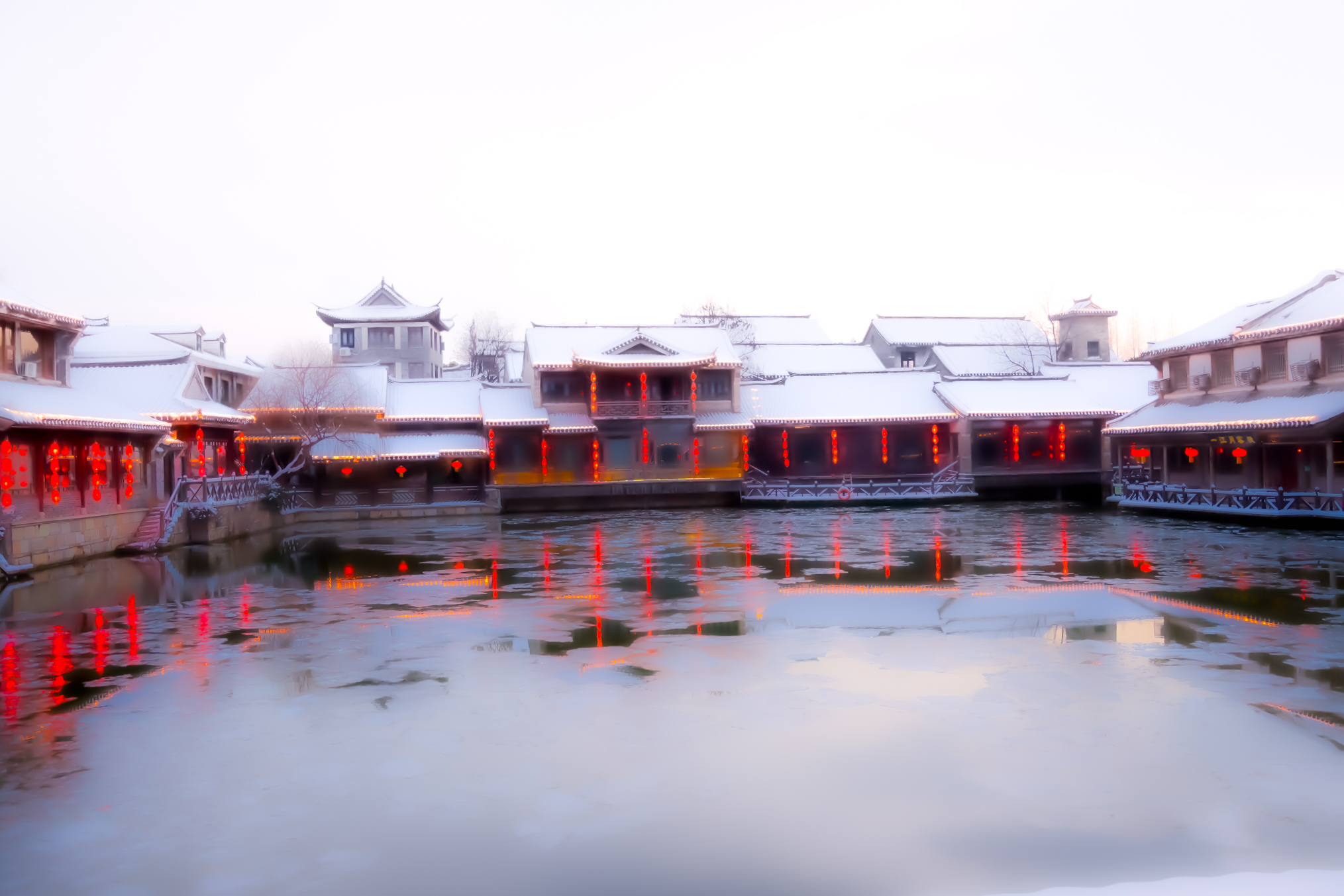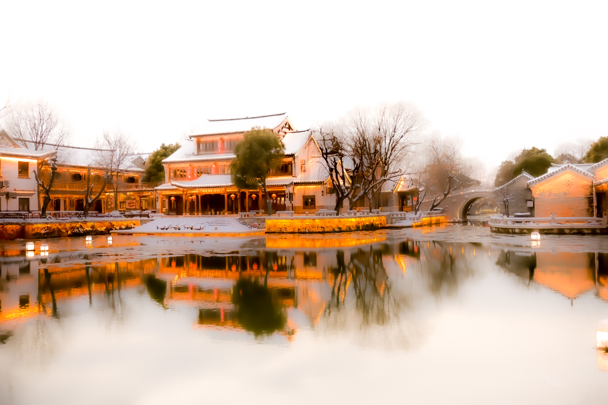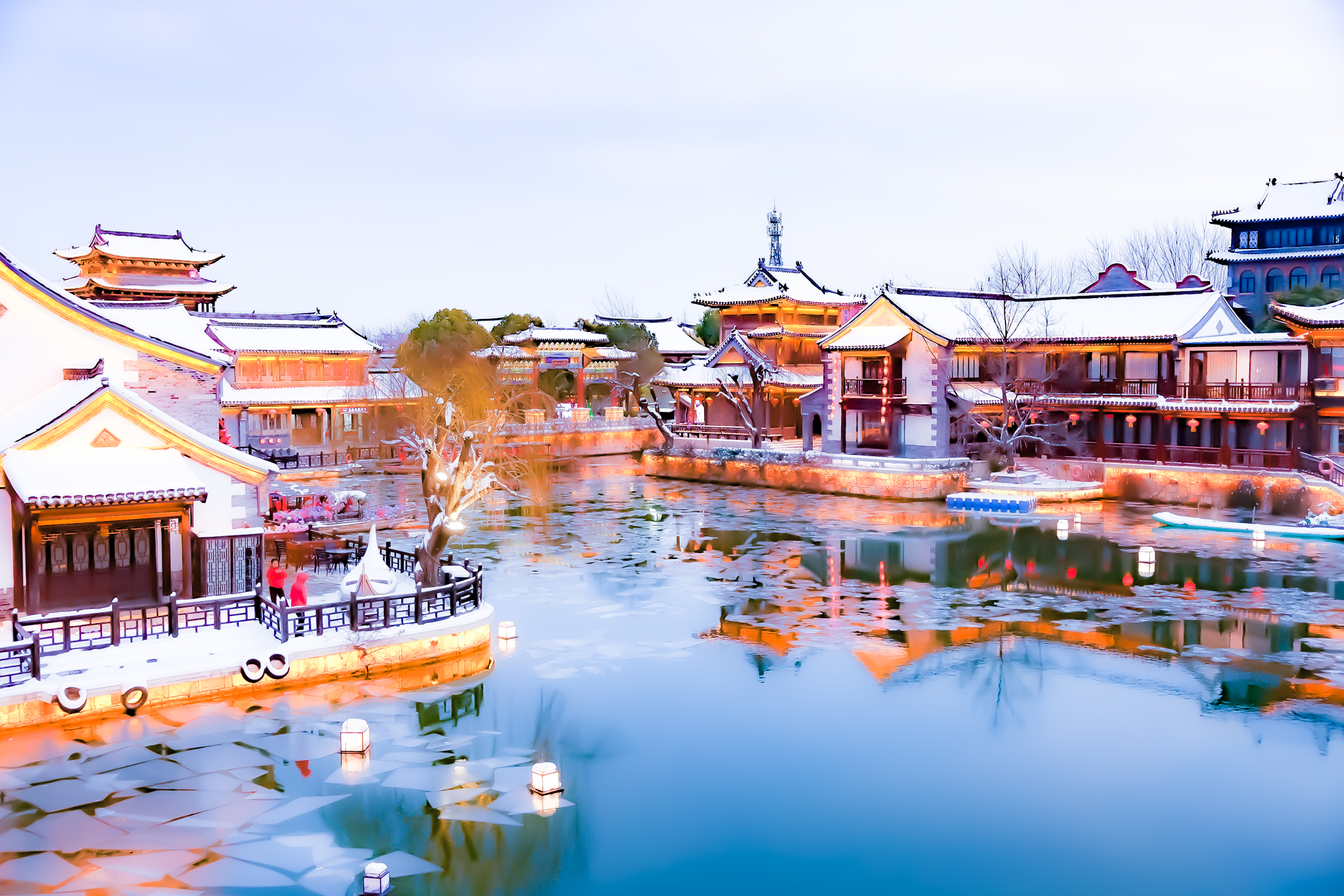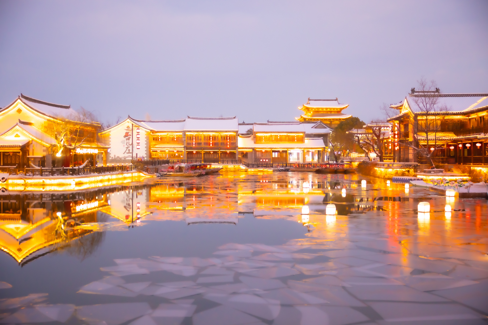 1月20日傍晚,华灯初上。雪后的台儿庄古城美景无法用言语形容,美到令人窒息。(台儿庄融媒台儿庄古城高启华时培京拍摄)