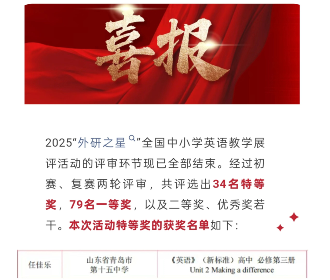 日前,2025“外研之星”全国中小学英语教学展评活动结果揭晓,青岛实验高中高二英语教师任佳乐凭借扎实的课堂设计与亮眼的教学表现,斩获青岛市唯一一个特等奖。