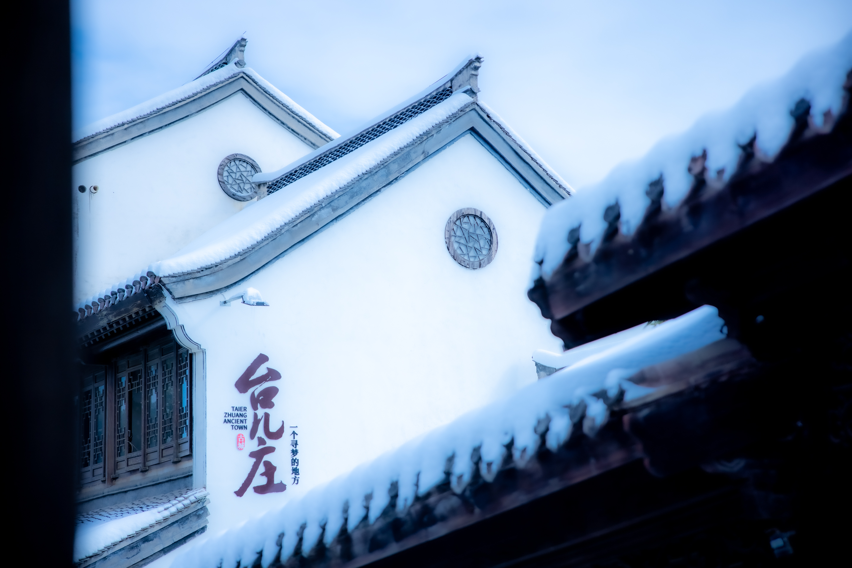 一夜风雪,台儿庄古城厚重的青黑屋檐覆上松软白雪,轮廓变得温柔,美得不像话,像诗。(台儿庄融媒高启华台儿庄古城时培京拍摄)
