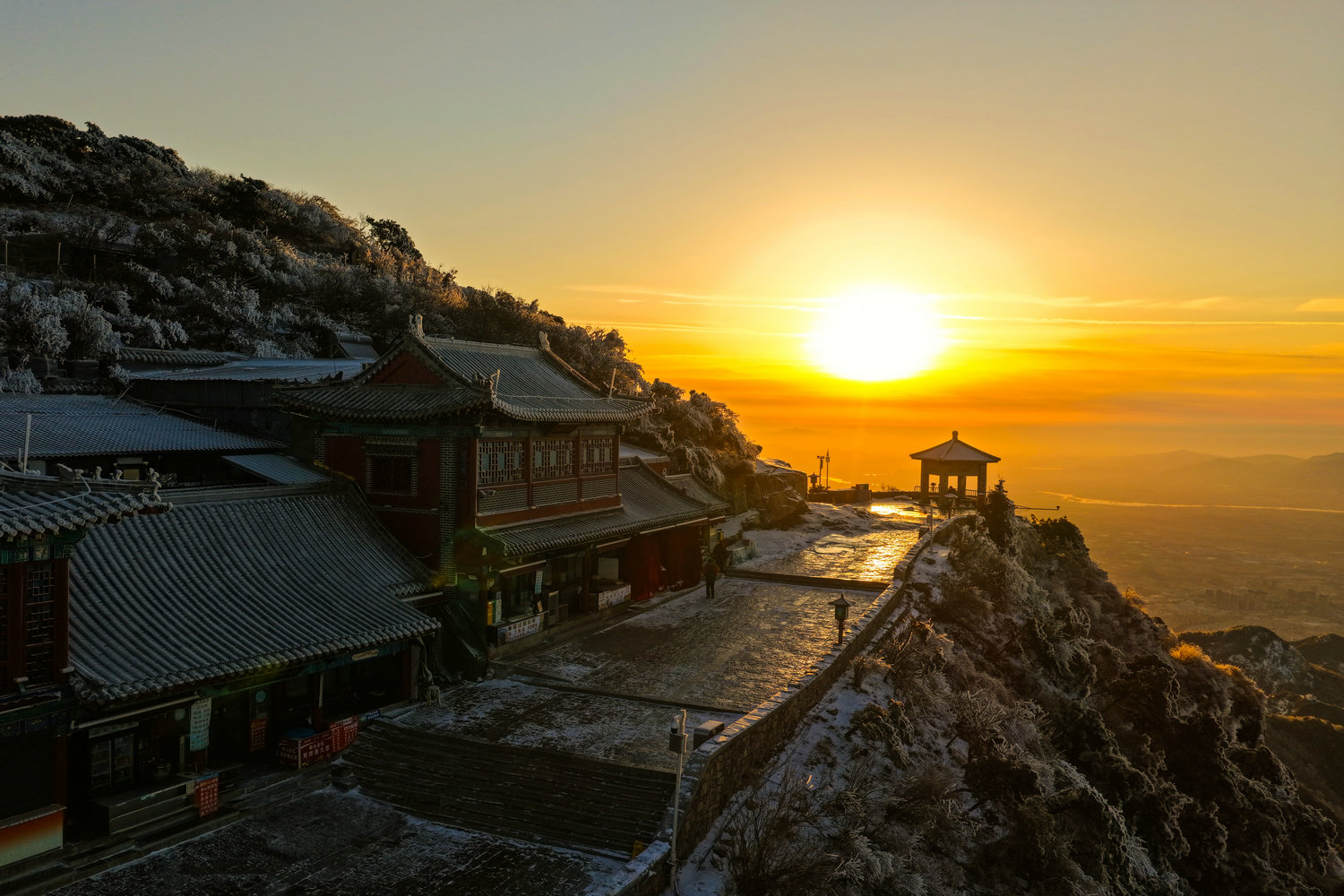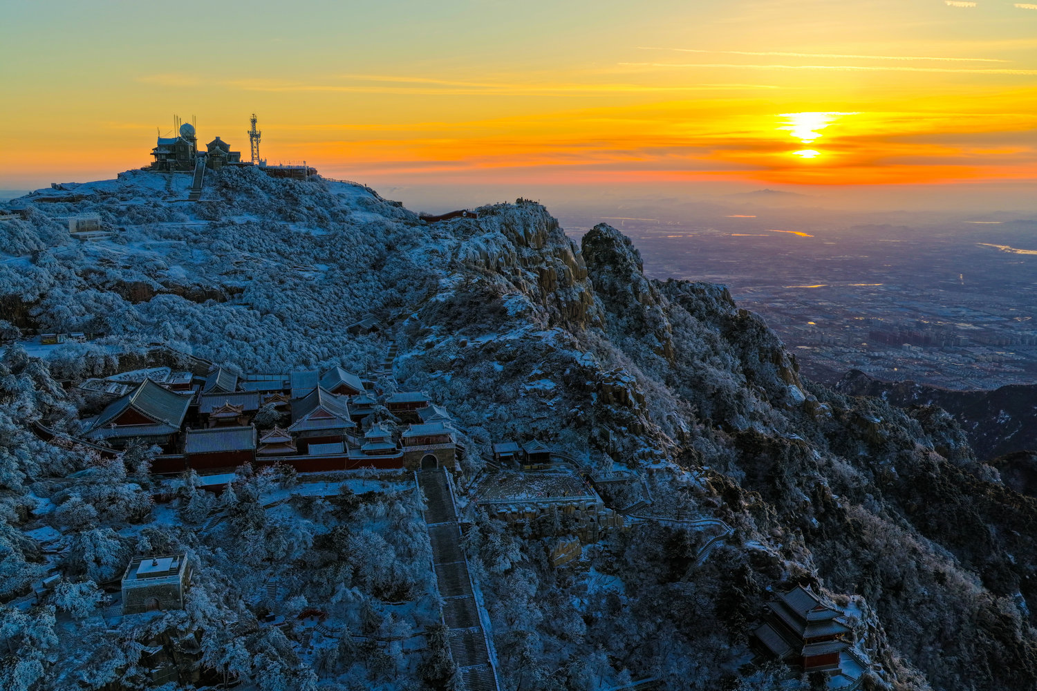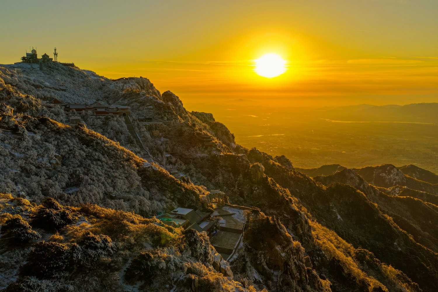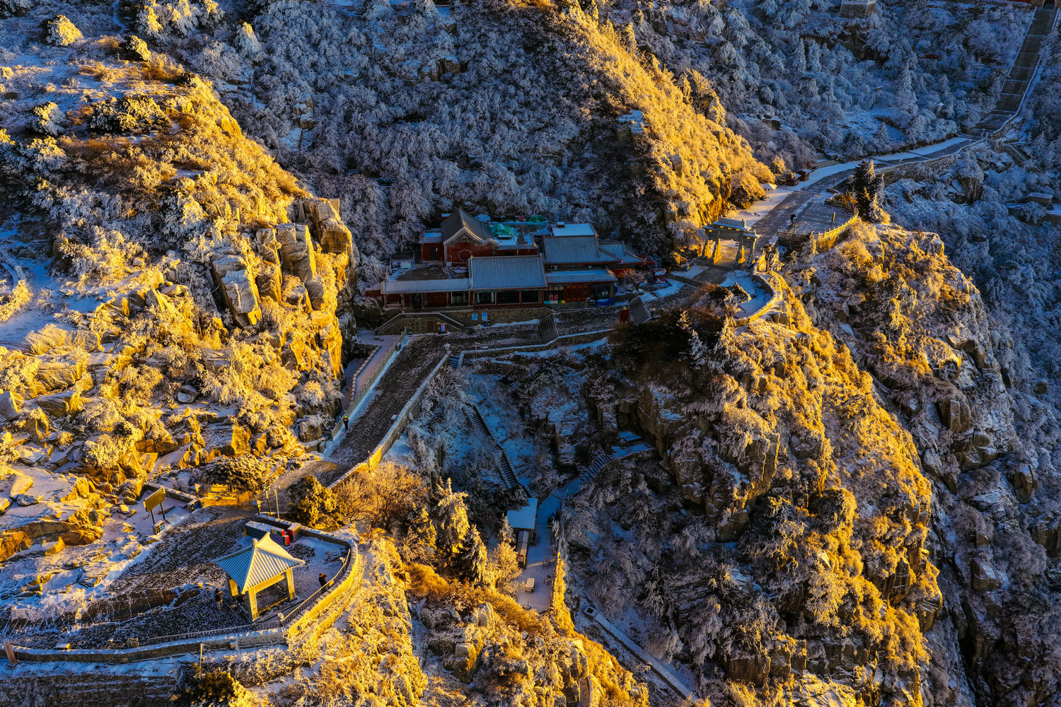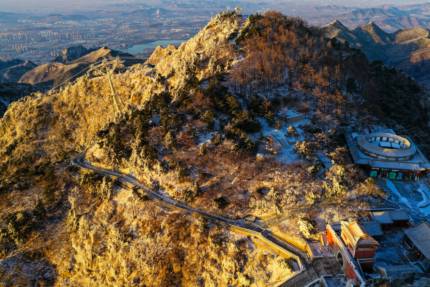 雪后的阳光泼洒在覆着雾凇的泰山之巅,深褐的岩峰被镀上一层柔润金边,霜花裹覆的草木折射出细碎的晶光,连蜿蜒的山间步道也浸在暖色调里,与未融的残雪形成明暗交织的纹理。远处的山峦与城市在薄雾中若隐若现,与近处被雾凇包裹的岩石、植被形成鲜明对比——洁白的霜花在暖光的映照下折射出晶莹的光泽,冷峻的山岩也被镀上一层柔和的金边。此刻,冷霜与暖光相织,古意与澄明共生,凝成一幅晴日岱宗图卷。