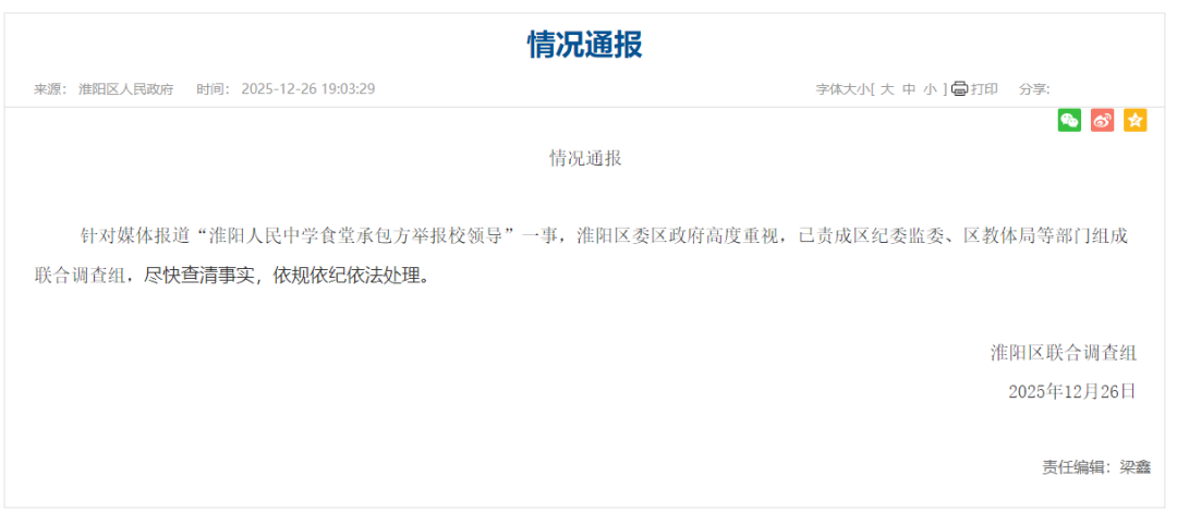 针对媒体报道“淮阳人民中学食堂承包方举报校领导”一事,淮阳区委区政府高度重视,已责成区纪委监委、区教体局等部门组成联合调查组,尽快查清事实,依规依纪依法处理。
