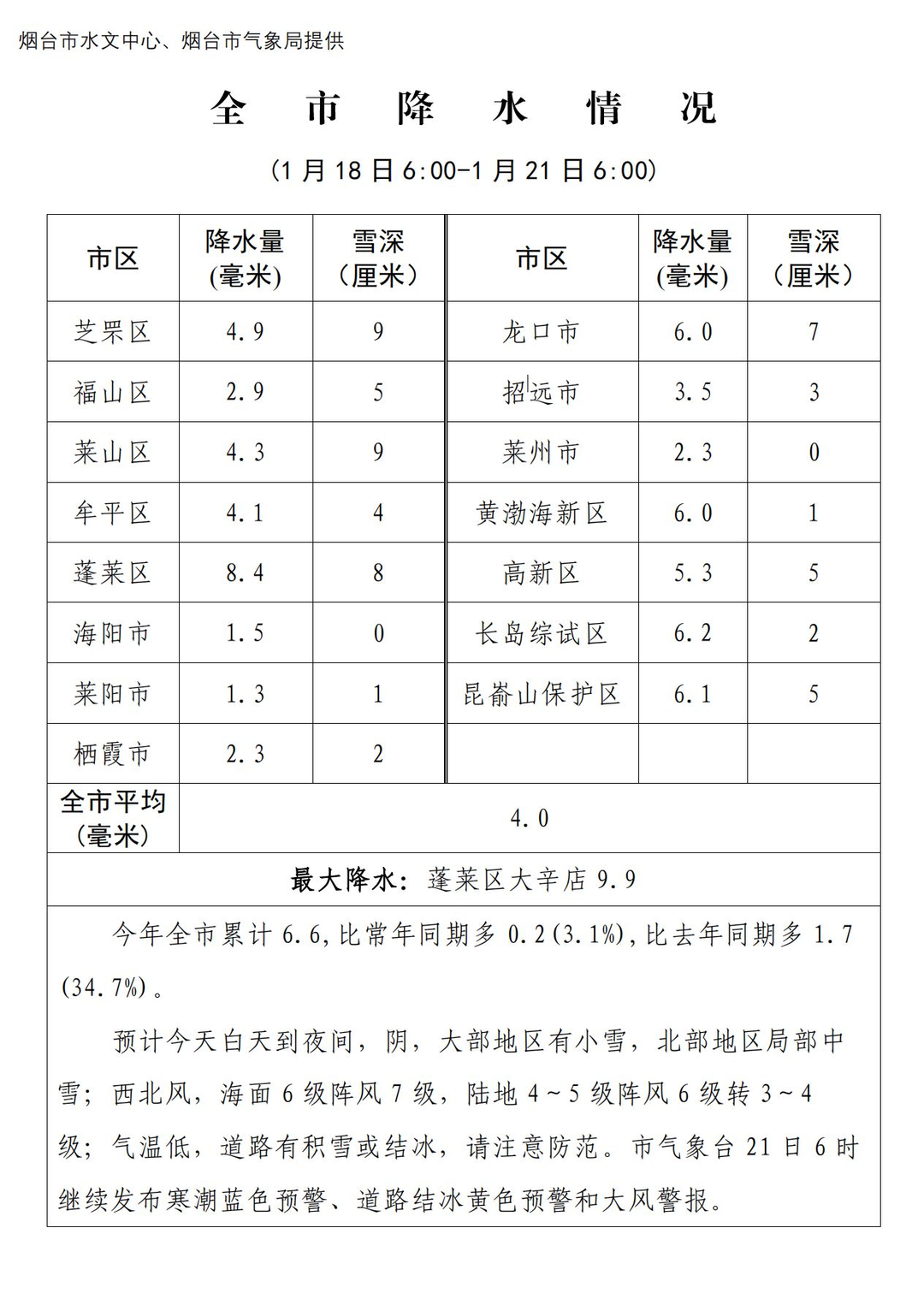 受寒潮影响,烟台市自1月18日起迎来新一轮降雪。截至目前,全市降水情况咋样,各区市积雪深度如何?1月21日早上,烟台市水文中心、烟台市气象局联合发布全市最新降水情况。